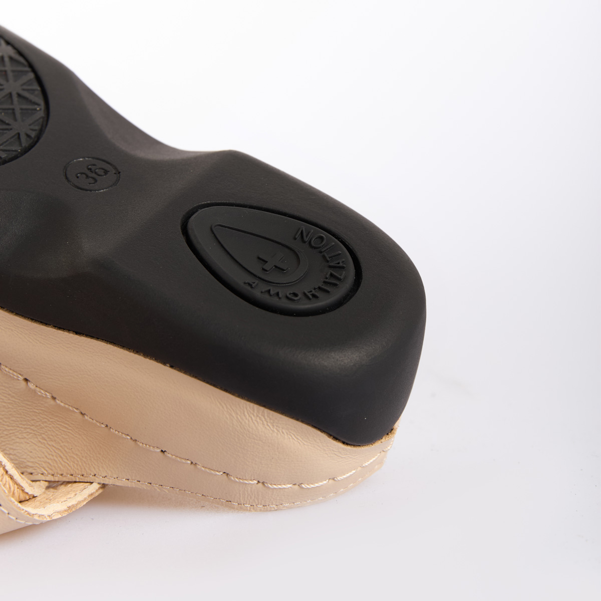 - амортизирующая подошва с зоной поддержки сводов, с зоной «толчка» и носочным перекатом улучшает биомеханику ходьбы. Антискользящие вставки из специального полимера повышают износоустойчивость обуви, а пяточный амортизатор снижает ударные нагрузки на суставы и позвоночник при ходьбе. Мягкость и упругость подошвы обеспечивает максимальный комфорт при длительном нахождении на ногах и отсутствие проскальзывания на любой поверхности.
