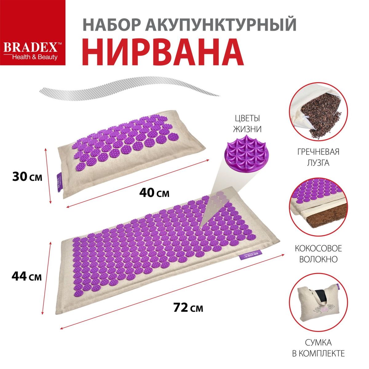 Акупунктурный набор премиум-качества отличается функциональностью и полностью натуральными материалами. Набор включает в себя массажный коврик, подушку и сумку. Цветы жизни – шипы уникальной формы – позволяют сделать массаж более приятным и комфортным, а наличие медицинского сертификата гарантирует эффективность и безопасность.