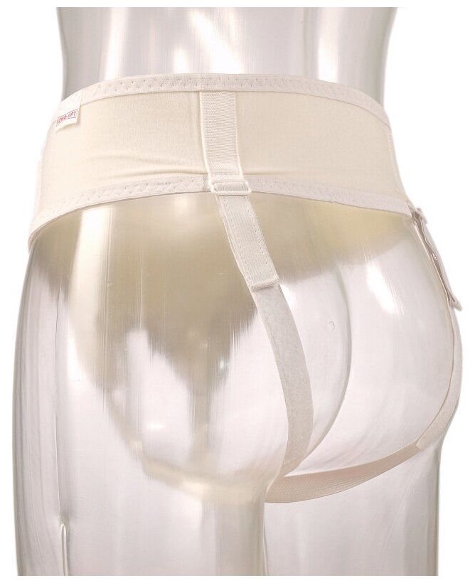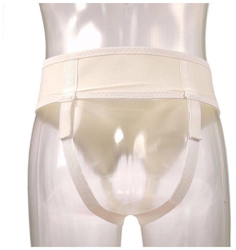 Ортез выполнен из комбинированных материалов. Представляет собой пояс со съемными пелотами на ленте из трикотажного материала с застежкой «велкро». Пелоты (ограничители) фиксируют область возможного грыжевого выпячивания или область послеоперационной раны. Дополнительная фиксирующая лента пропускается через промежность и фиксируется на поясе при помощи застежки. Перед надеванием бандажа, рекомендуется аккуратно вправить грыжевое выпячивание в брюшную полость. Плотность прилегания бандажа регулируется при помощи специальных застежек «велкро». Применение данного ортеза после операций значительно уменьшает болевой синдром и укорачивает период реабилитации. Может применяться при плавании, купании, в душе.