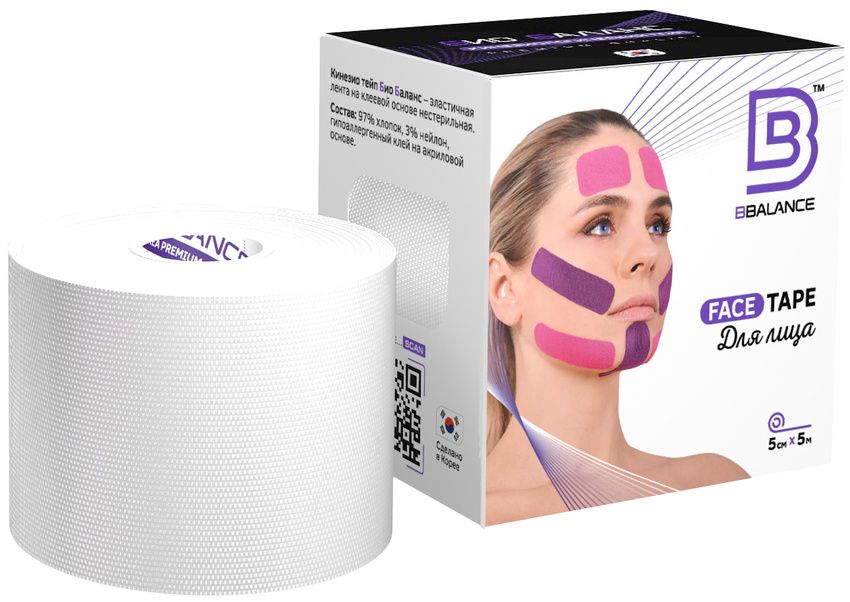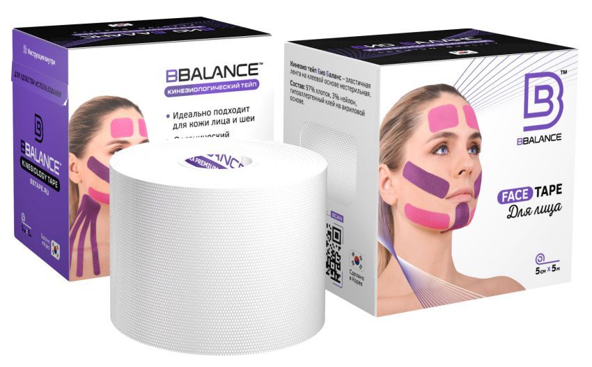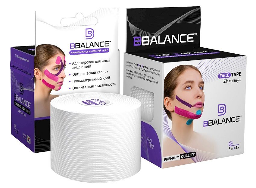 В каждой упаковке BBalance Face Pack содержится хлопковый кинезио тейп с мягким клеем, специально разработанный в Ю.Корее для эстетического тейпирования лица и шеи, шириной 5 см и длиной 5 м. Данный размер идеально дополняет набор узких хлопковых кинезио тейпов BB FACE TAPE™ 2,5 см × 10 м и подходит для большинства видов аппликаций на область лица и шеи.