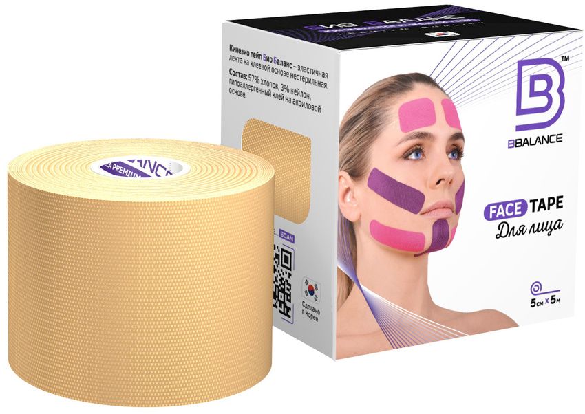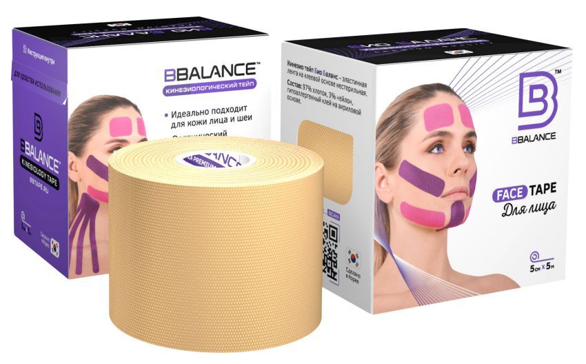 В каждой упаковке BBalance Face Pack содержится хлопковый кинезио тейп с мягким клеем, специально разработанный в Ю.Корее для эстетического тейпирования лица и шеи, шириной 5 см и длиной 5 м. Данный размер идеально дополняет набор узких хлопковых кинезио тейпов BB FACE TAPE™ 2,5 см × 10 м и подходит для большинства видов аппликаций на область лица и шеи.