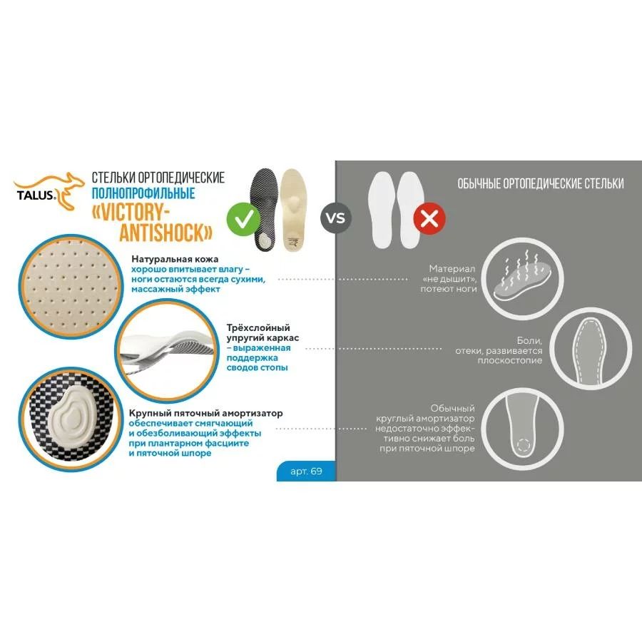 - Стельки «Victory Antishock» обеспечивают благоприятный микроклимат внутри обуви, правильное положение стопы при ходьбе, снижают утомляемость ног.