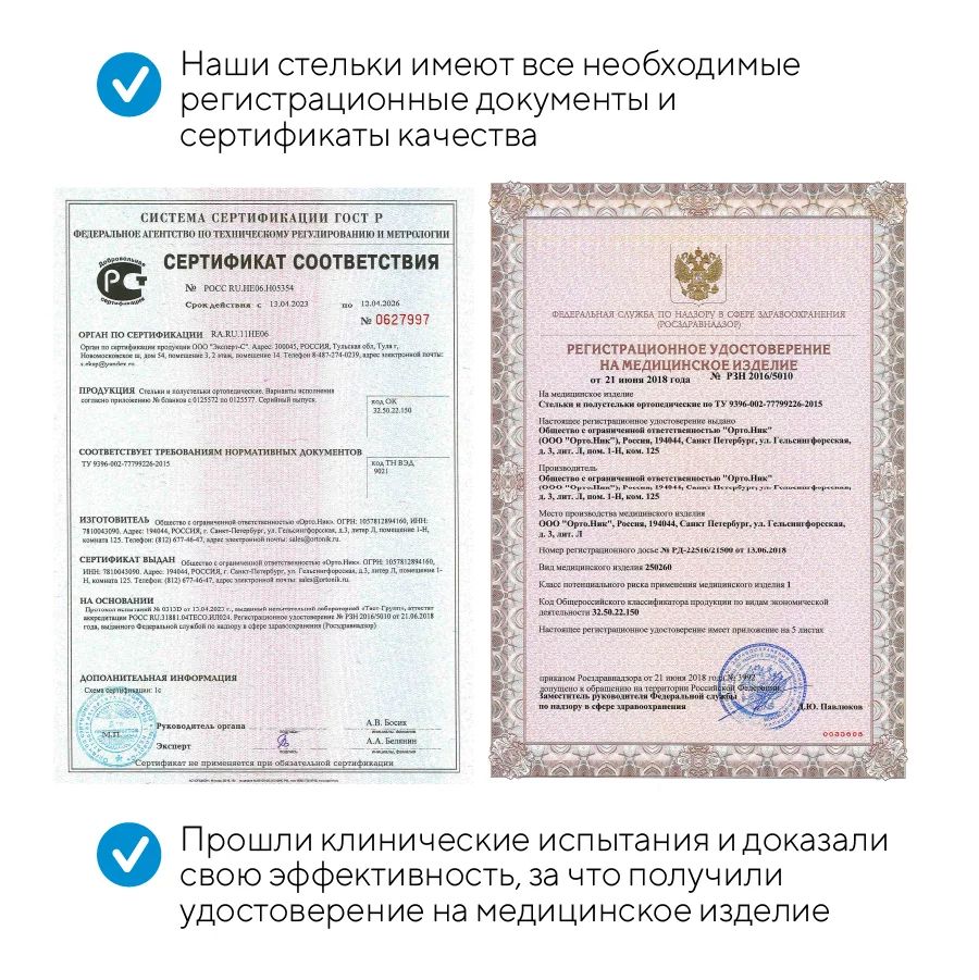 Многослойный каркас из термопластичного материала с выступами в форме "бабочка", особой формой метатарзального валика, разгружает передний отдел стопы, облегчая симптомы метатарзалгии. Чашеобразная пятка удерживает стопу в правильном положении. Поддержка продольного и поперечного свода стопы уменьшают ударную нагрузку на суставы стоп, коленные и тазобедренные суставы.