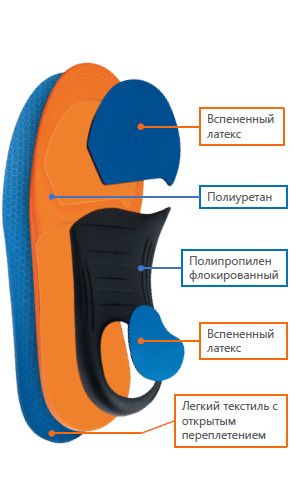 • За счет анатомически правильной вкладки основного слоя осуществляется легкая поддержка и разгрузка переднего отдела стопы. Полиуретановая основа - обеспечивает комфортность и удобство стельки при использовании.