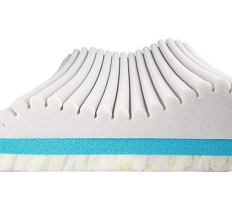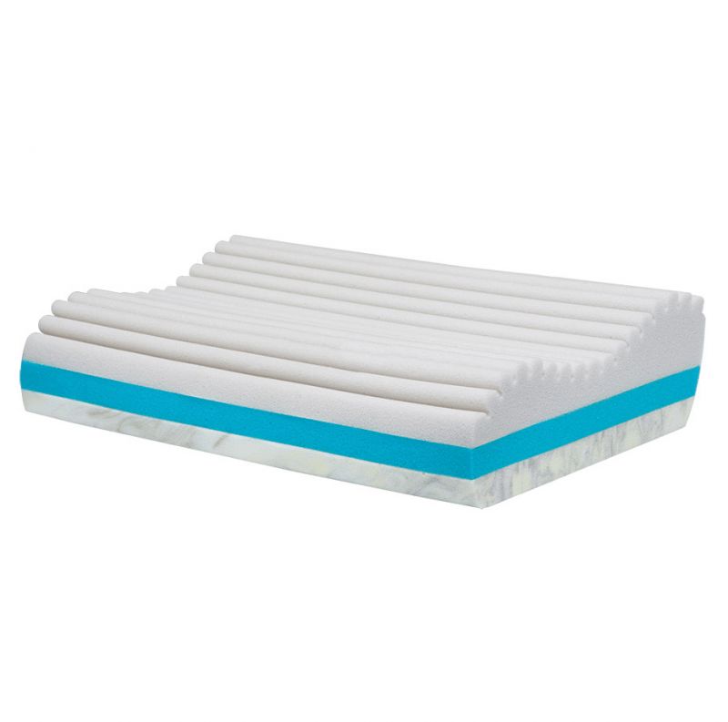 - верхний слой с «эффектом памяти» и валиками различной высоты обеспечивает правильное положение головы и шеи, дарит ощущение невесомости, не препятствует воздухообмену