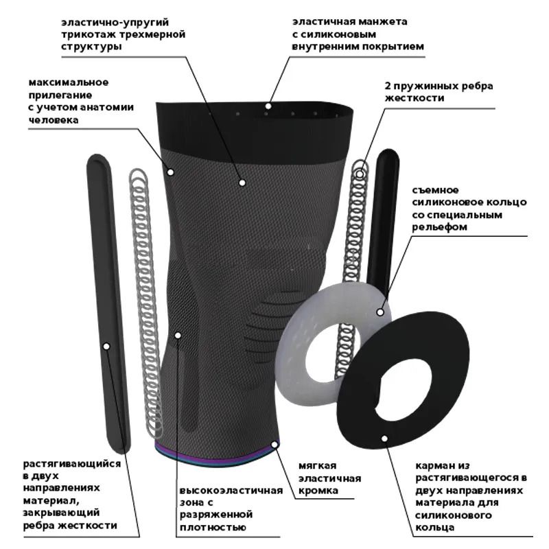 - съемное силиконовое кольцо анатомической формы со специальным рельефом разгружает и стабилизирует надколенник