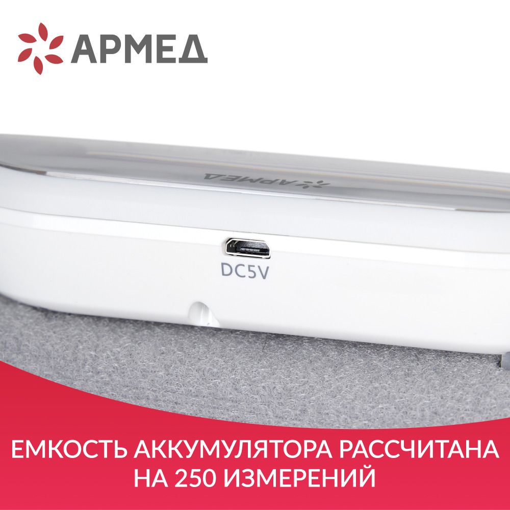 Тонометр работает от встроенного литий-ионного аккумулятора, емкости которого хватит на 250 измерений. Кабель для зарядки в комплекте.
