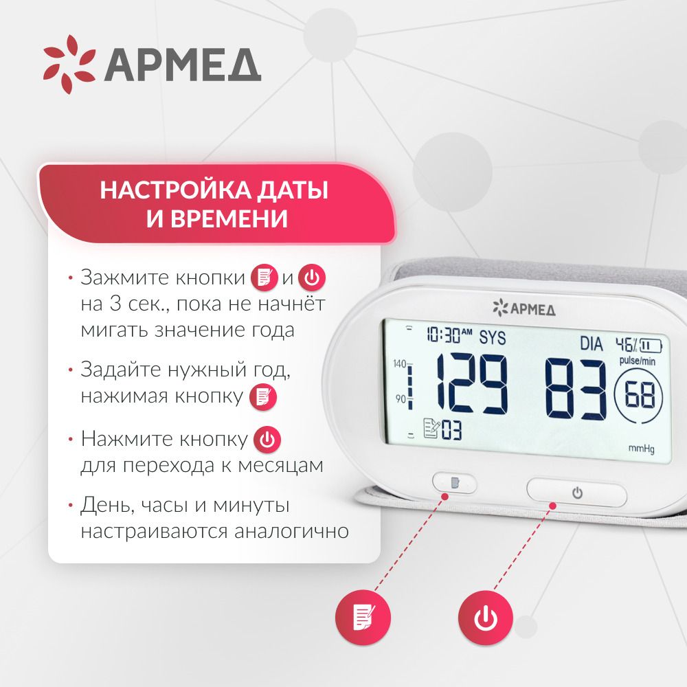 Функционал тонометра позволяет установить текущие дату и время, что обеспечит более информативное отслеживание динамики изменений.