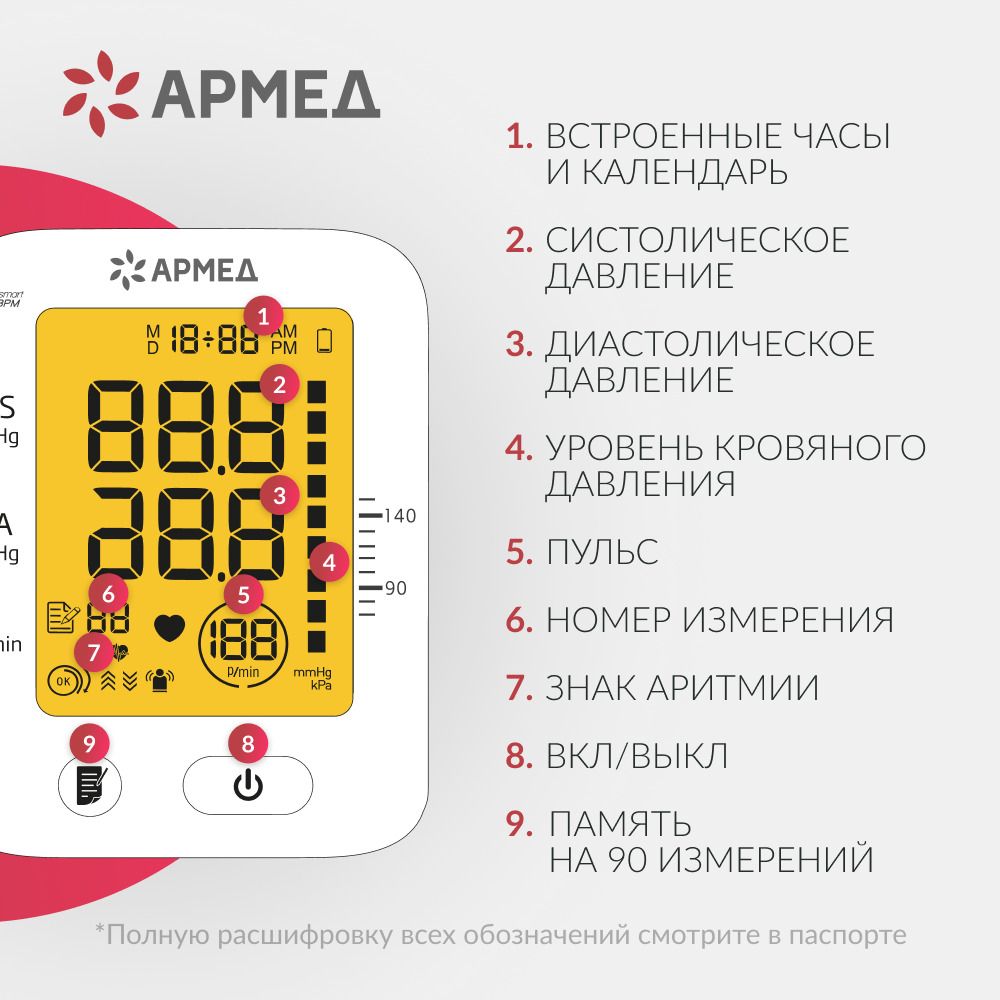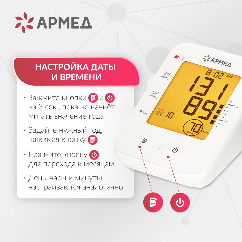 В памяти устройства можно хранить данные до 90 измерений с указанием даты и времени.